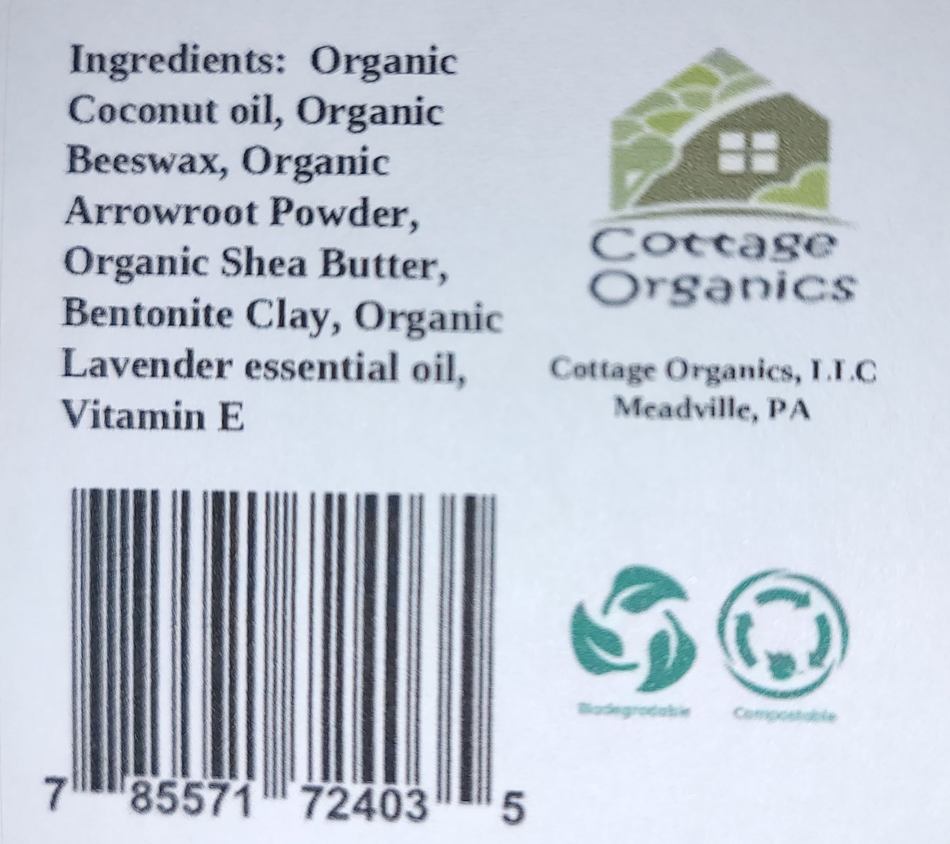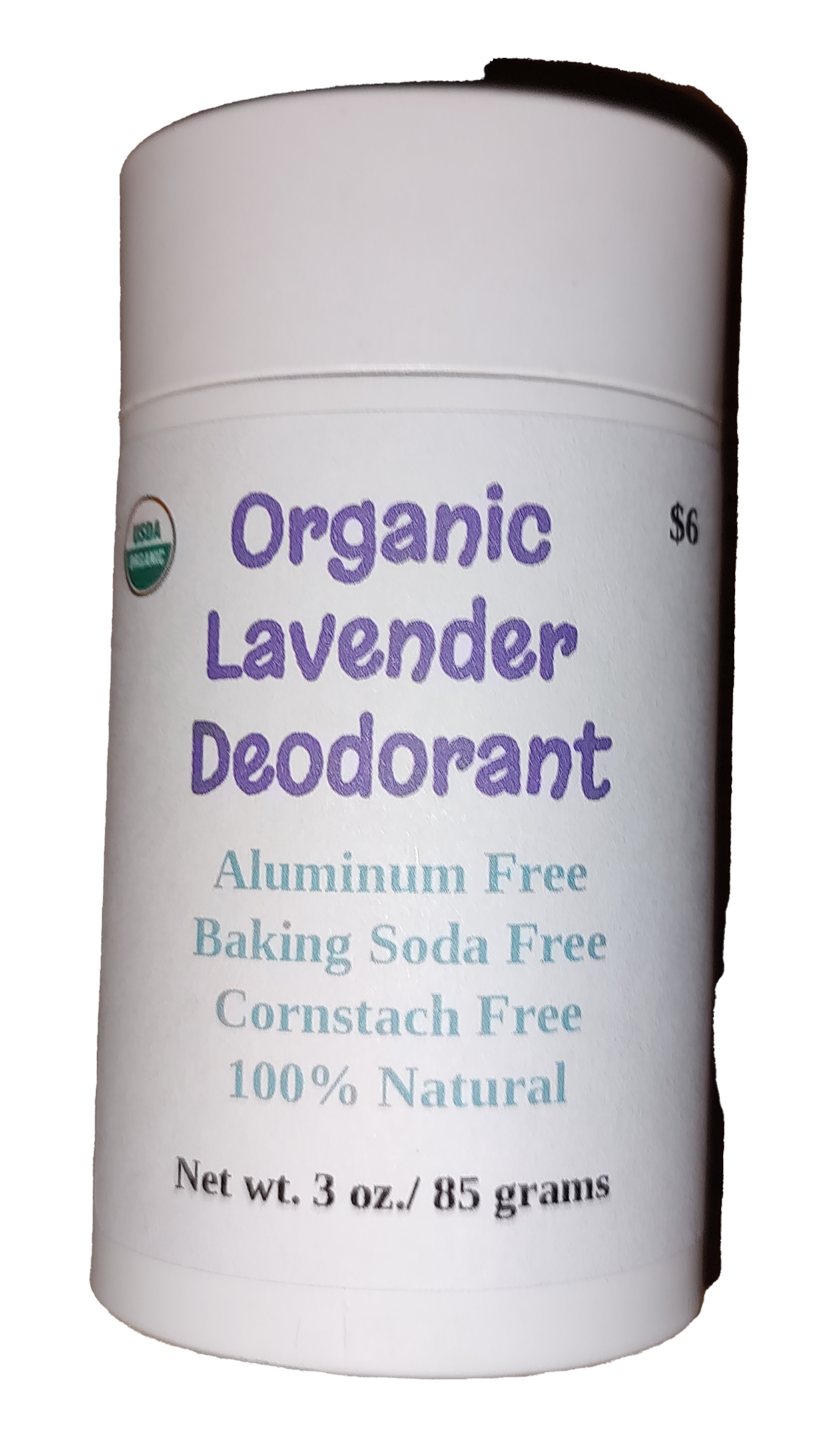 Certified Organic and Certified Vegan Lavender Deodorant. Amazing Lavender fragrance and this deodorant is aluminum free, baking soda free and cornstarch free, for a deodorant perfect for any skin type including sensitive skin. The bentonite clay is better than baking soda, but turns the deodorant green, so this is not your typical white deodorant. The packing is recyclable and home compostable.