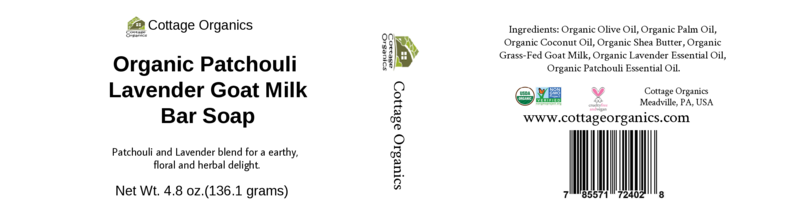 Ingredients: Organic Olive Oil, Organic Palm Oil, Organic Coconut Oil, Organic Shea Butter, Organic Grass-Fed Goat Milk, Organic Lavender Essential Oil, Organic Patchouli Essential Oil.
